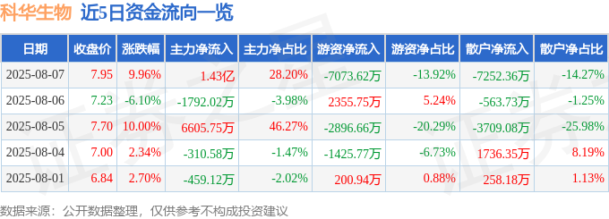 占总成交额14.27%。8月7日的资金流向数据方面,3次打开涨停,收盘价7.95元。
